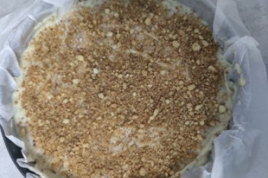 Застелите форму для выпекания пергаментом и вылейте в неё тесто.