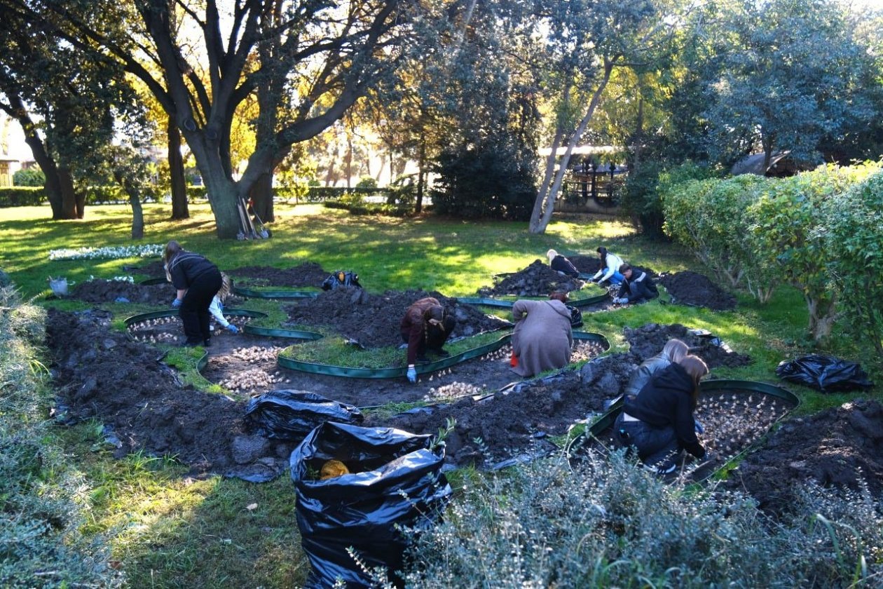 Планируют использовать 40 тысяч луковичных, это тюльпаны, нарциссы, гиацинты, крокусы. Остальные цветы — традиционные маргаритки, незабудки, виолы и декоративная капуста.