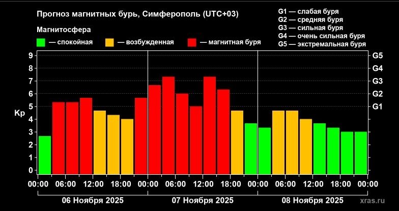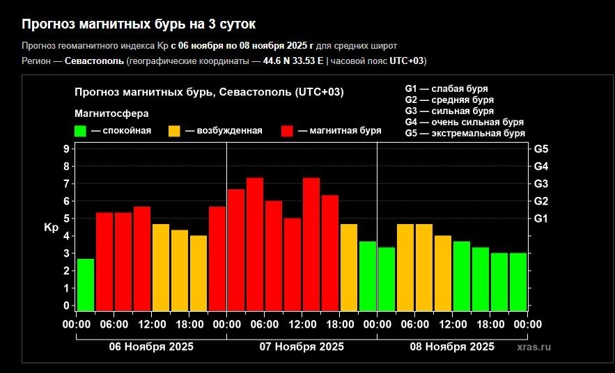 SevastopolMedia, 6 ноября. Мощная магнитная буря обрушилась сегодня, 6 ноября, на Крымский полуостров, сообщают на сайте лаборатории солнечной активности ИКИ и ИСЗФ. В четверг высокая активность продлится до полудня, потом немного пойдет на спад.
