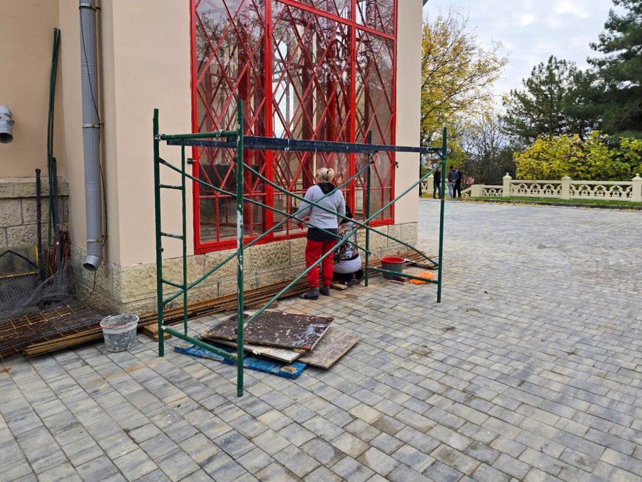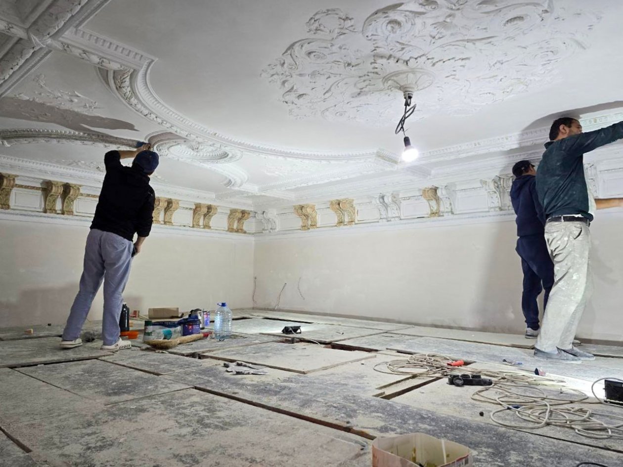 "Уже завершены работы по укреплению грунта под фундаментом, усиление кладки стен, реставрация беседки и стилобата ограждения, прокладка наружных инженерных сетей и освещения, монтаж внутренних систем отопления, вентиляции, водо— и электроснабжения", — отметил предсовмина.