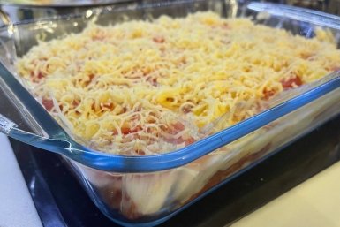 Посыпьте половину раскатанного теста двумя ложками панировочных сухарей, сверху выложите начинку и посыпьте оставшимися сухарями.