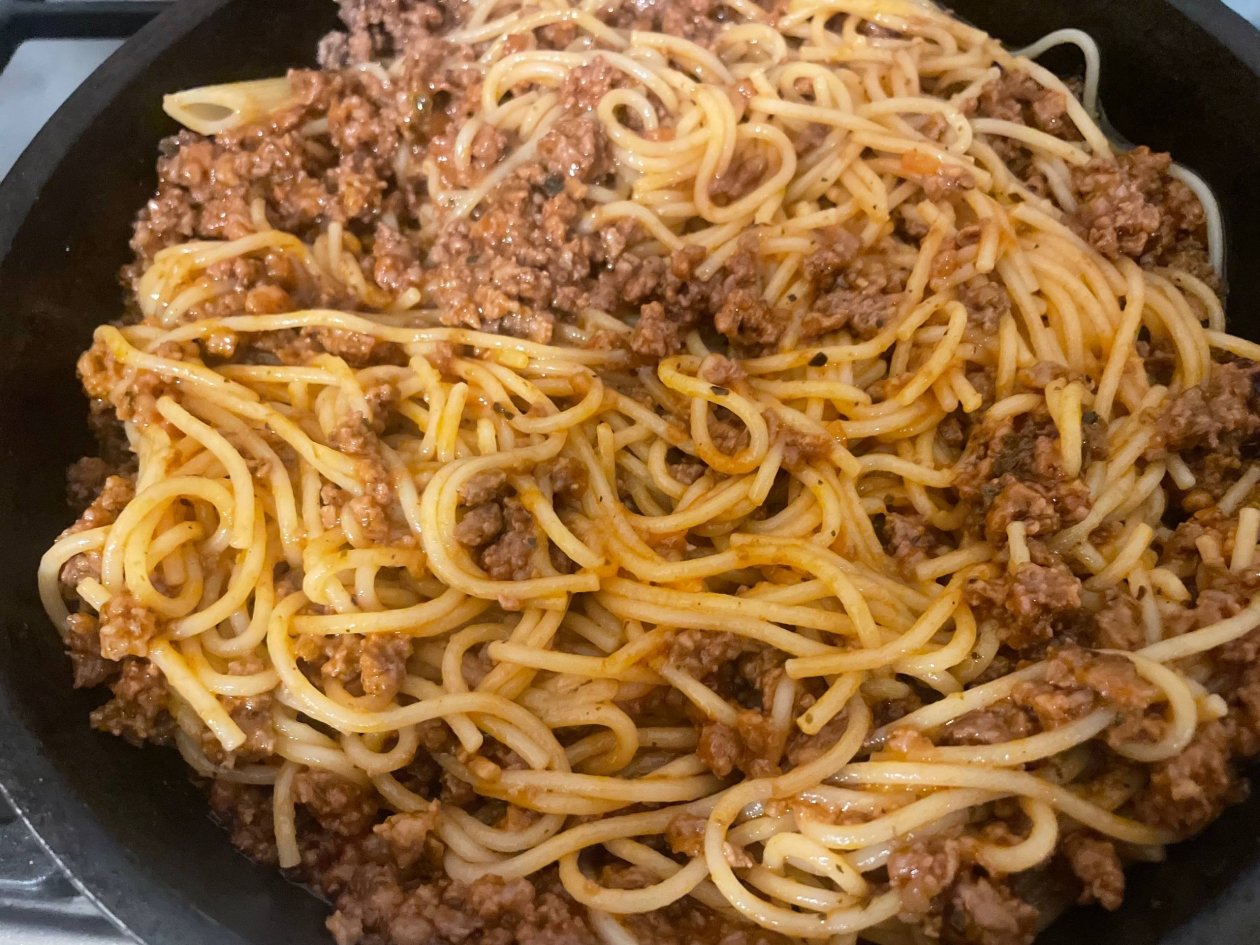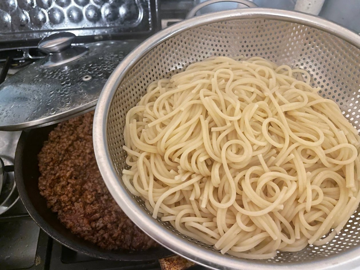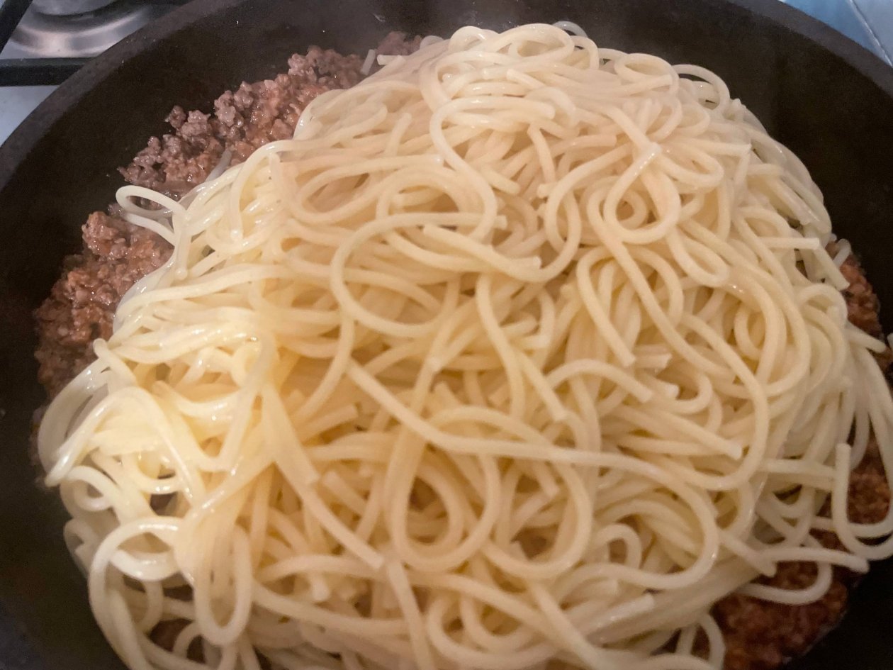 Сваренные спагетти откиньте на дуршлаг. Сразу же добавьте их к мясному соусу на сковороде и аккуратно перемешайте, чтобы каждая макаронина покрылась ароматной заправкой.