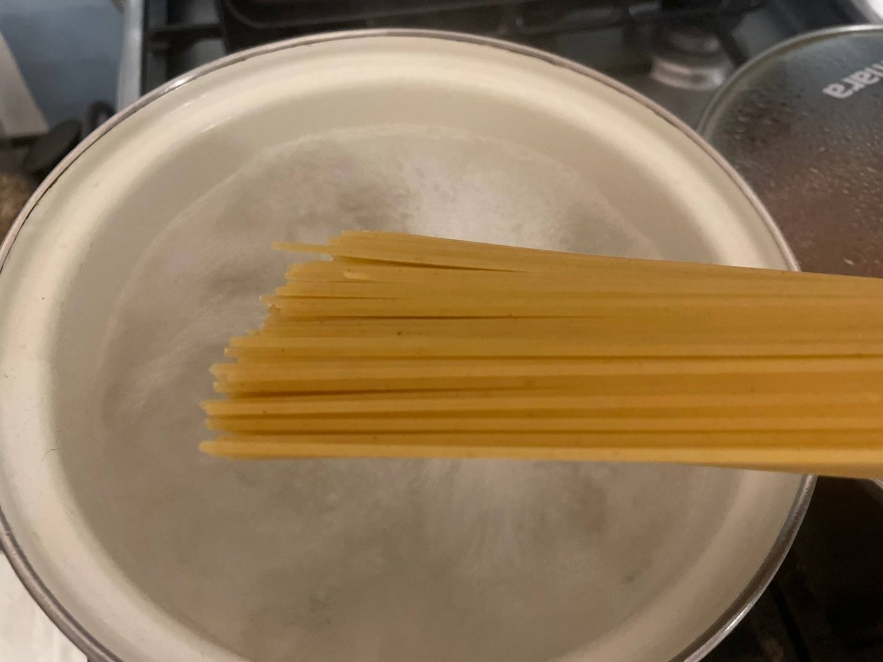 Поставьте на большой огонь кастрюлю с подсоленной водой. После закипания опустите в нее спагетти. Традиционно их не ломают, а аккуратно погружают в воду, пока они не станут мягче. Варите их согласно инструкции на упаковке, обычно около 10–12 минут, до состояния, когда паста уже мягкая. Проще говоря, чуть больше, чем состояние "аль-денте".