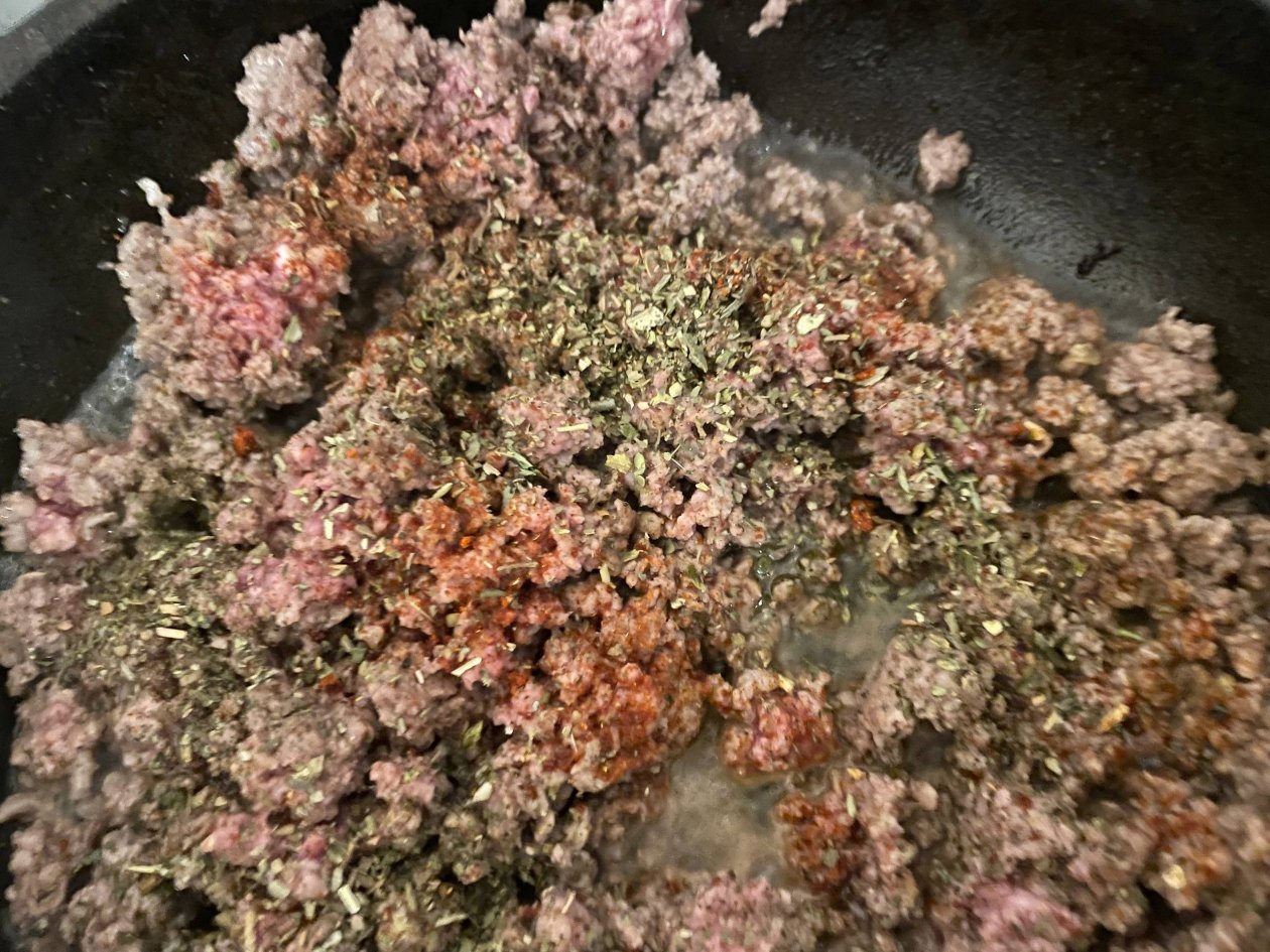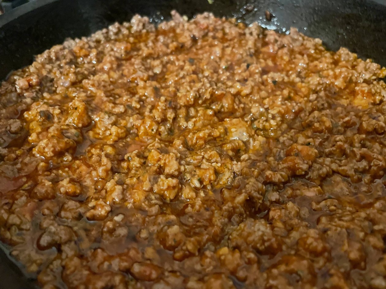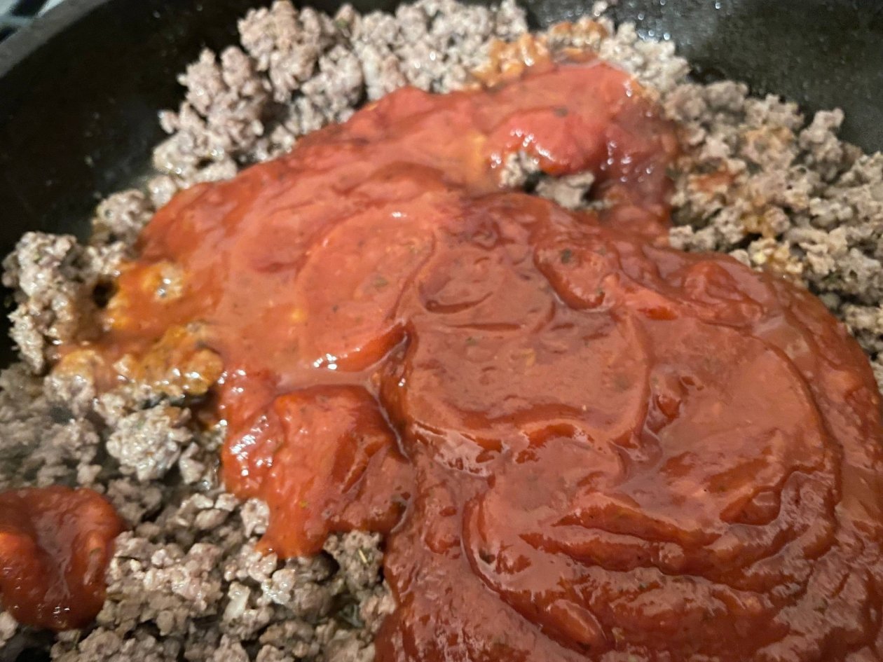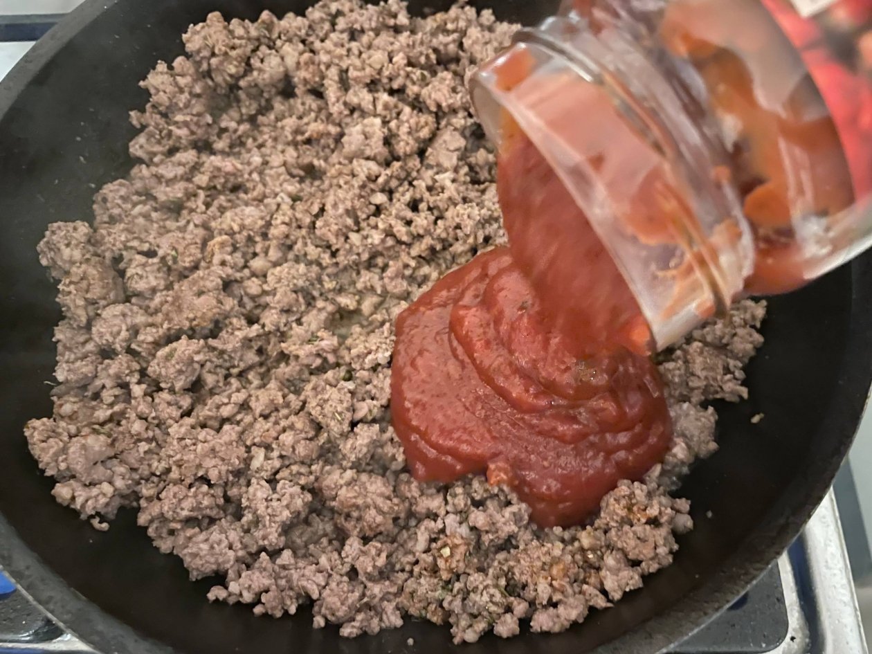 В готовый фарш добавьте ваши любимые специи: щепотку паприки, ароматный базилик, итальянские травы и чеснок. Затем влейте весь соус "Болоньезе" из банки. Тщательно перемешайте и потомите под крышкой на медленном огне 5–7 минут, чтобы вкусы соединились в единую гармонию.