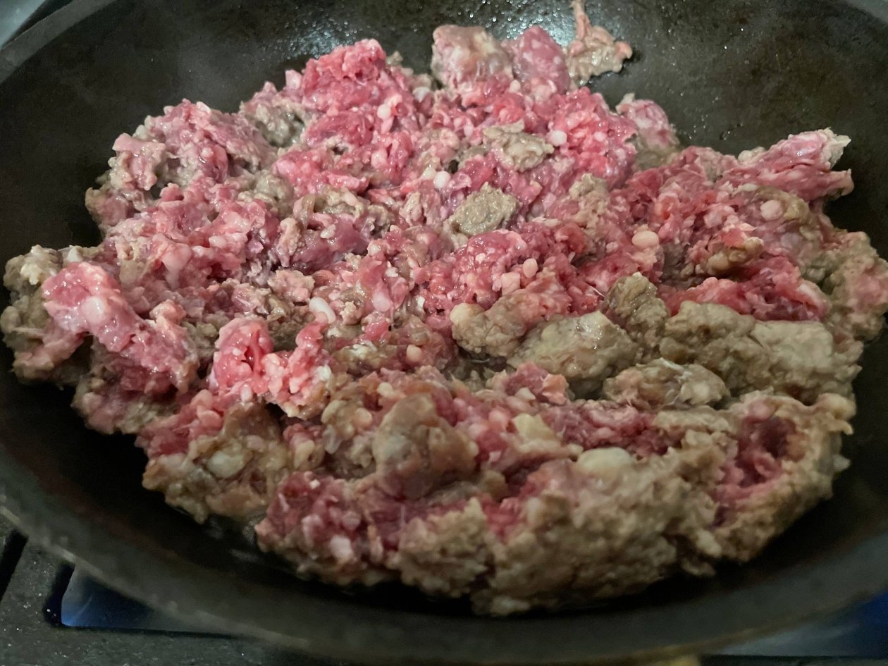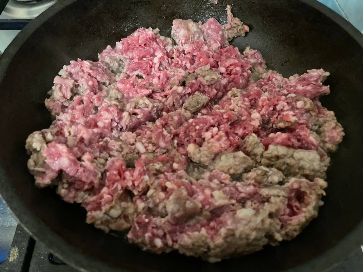 Если мясо было заморожено, заранее достаньте его для разморозки. На разогретую сковороду с небольшим количеством масла выложите говяжий фарш. Обжаривайте его на среднем огне 7–10 минут, постоянно помешивая и разбивая комочки, до образования румяного оттенка.