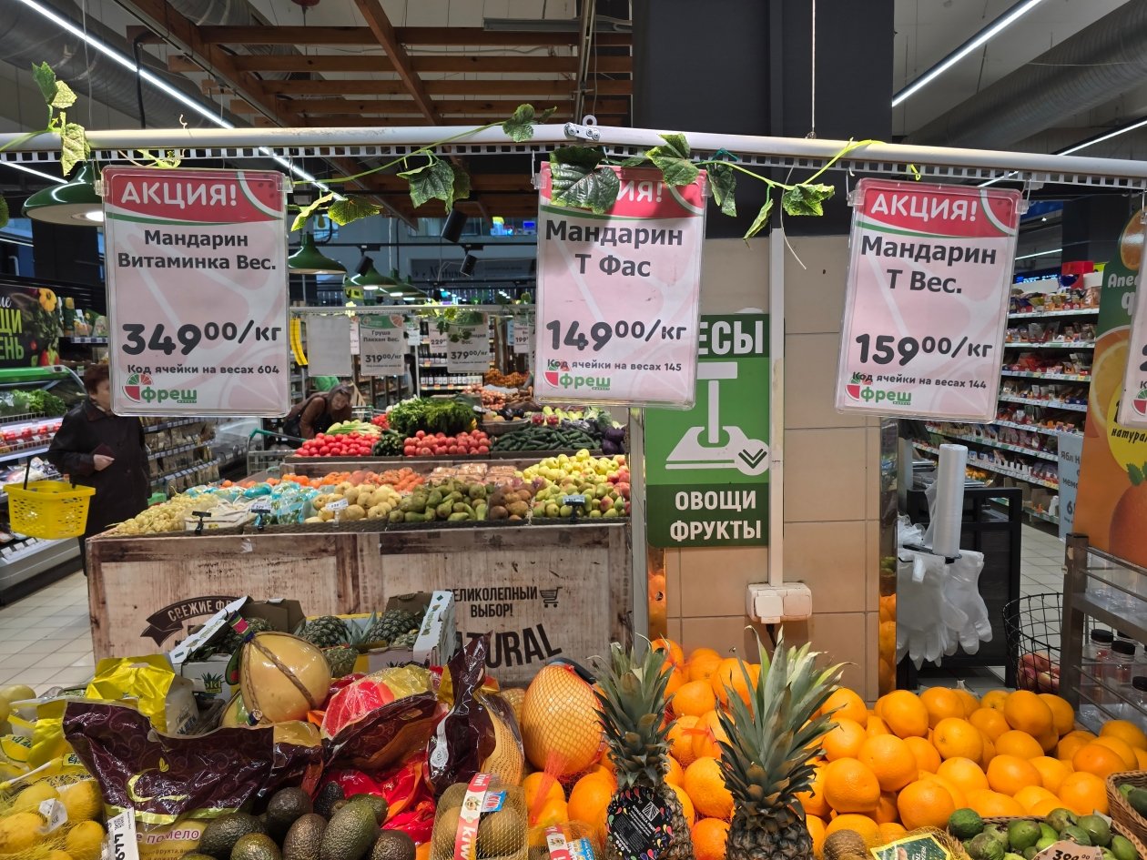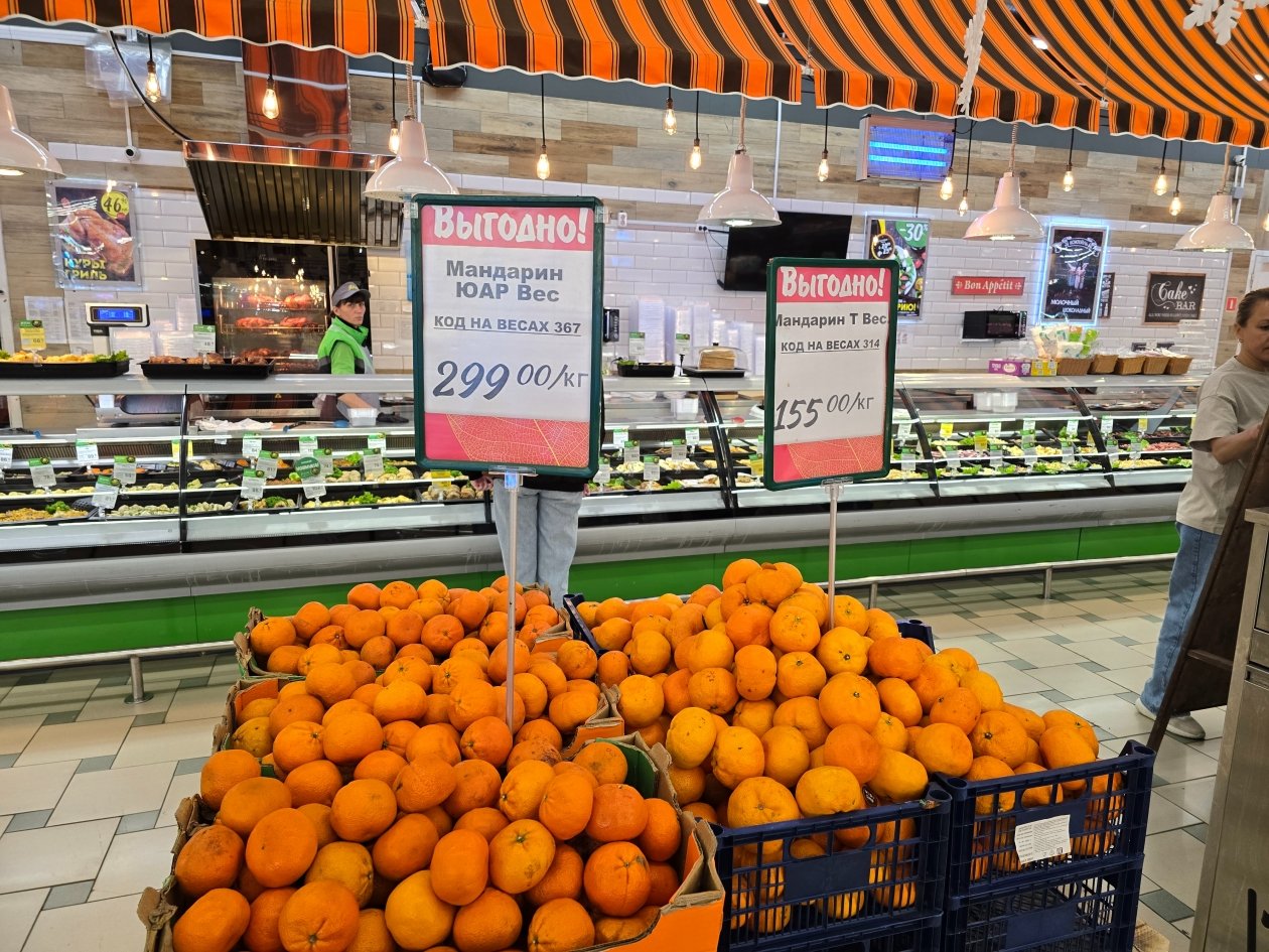 В торговых сетях фрукт обойдется дороже. В супермаркете "Яблоко" южноафриканские мандарины стоят 299 рублей/кг, "бэйби" — 259 рублей/кг, сочный китайский — 299 рублей/кг, турецкие — 155 рублей/кг. Во "Фреше" сорт "Витаминка" предлагают по цене 349 рублей/кг, турецкие мандарины — от 149 рублей/кг.