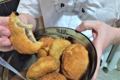 Доведите воду до кипения, затем посолите. Очистите и нарежьте картофель. Мелко нарежьте лук и морковь. Обжарьте овощи на растительном масле.
