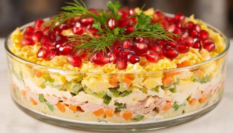Щедро украсьте верх и бока салата зернами граната. Дайте блюду настояться в холодильнике минимум 1-2 часа, чтобы все слои пропитались.
