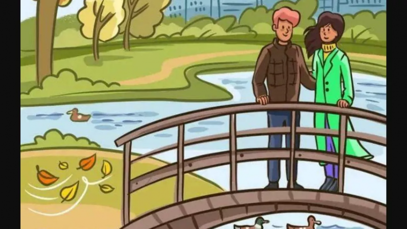 На изображении представлена влюбленная пара на мосту над рекой в осенний день. На первый взгляд, ситуация кажется обычной, однако присутствует несоответствие.