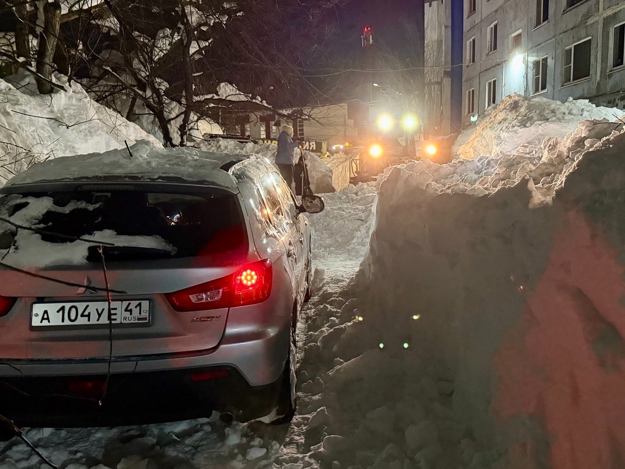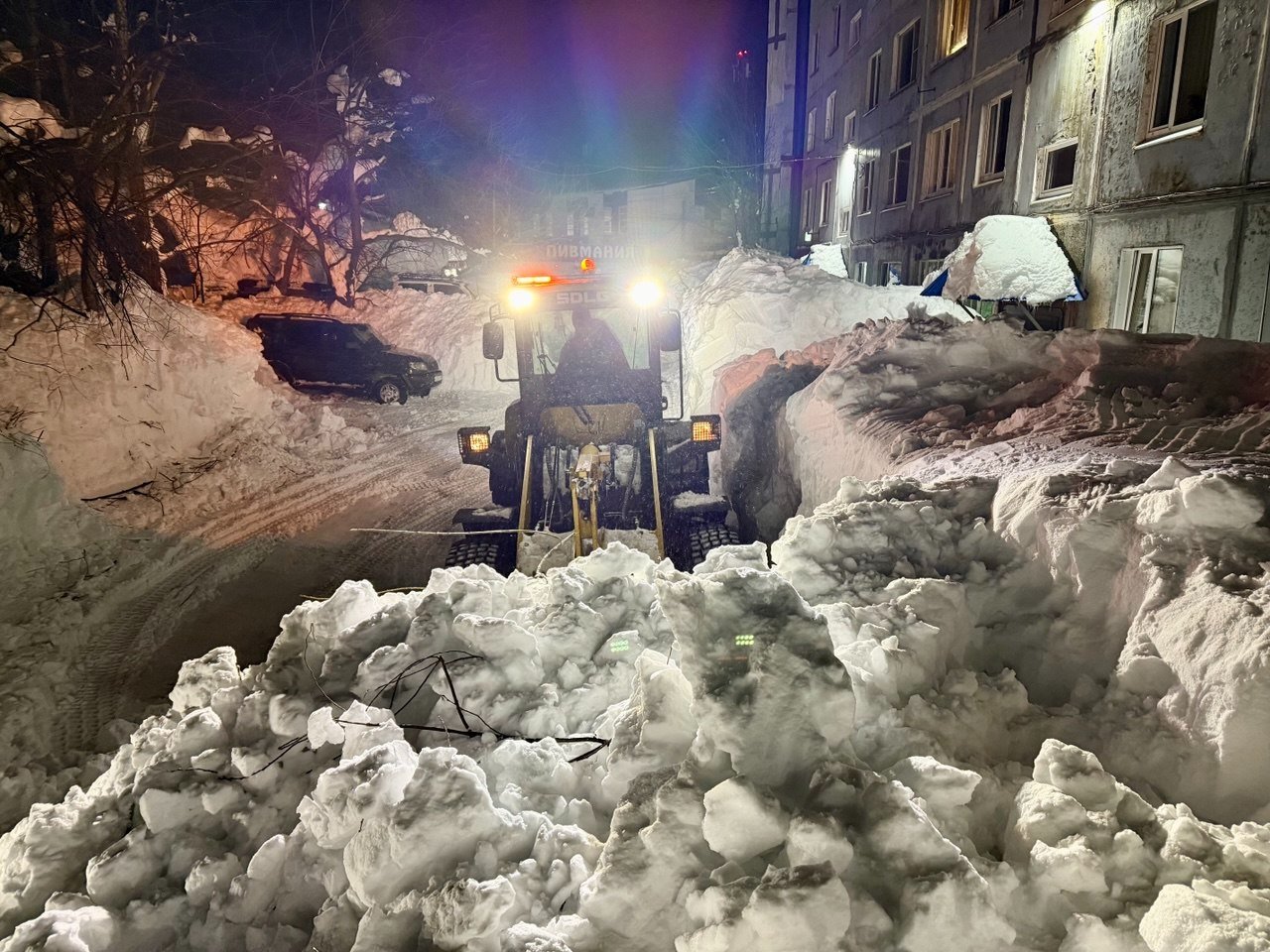 Обычный двор в Петропавловске-Камчатском. Последний раз снег убирали в середине декабря. После всех циклонов проезд полностью заблокирован уже две недели. Невозможно вывезти мусор, проехать пожарным и скорой, подвести товары в окрестные магазины. Попытка погрузчика пробиться в соседний двор закончилась крахом — спецтехника чуть не свалилась в яму со свежеоткопанным автомобилем, а потом превратила въезд в площадку для могула с трамплинами и ухабами.