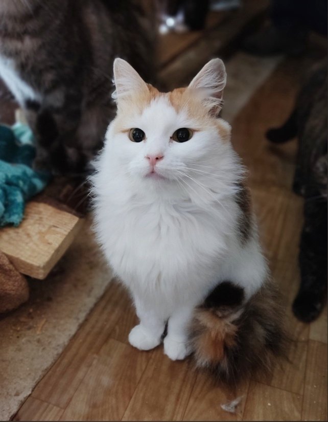Трехцветная Касатка готова радовать душу и взор новых друзей и быть примерной лапочкой. У нее очень грустная история в прошлом: была выброшена родственниками ее пожилой хозяйки, бедняга сидела три дня без воды и еды в хозпостройке. Заметили мурлыку случайно, забрали на передержку, стерилизовали. Потом ее стала искать хозяйка, забрала под договор, оплатила стерилизацию, но в итоге Касатка снова в центре — не дали ей жизни дома. Даже в котообщежитии она показала себя славной и трогательной, будто пушистое солнышко. А еще есть примета, что трехцветные кошки приносят счастье. Проверите?