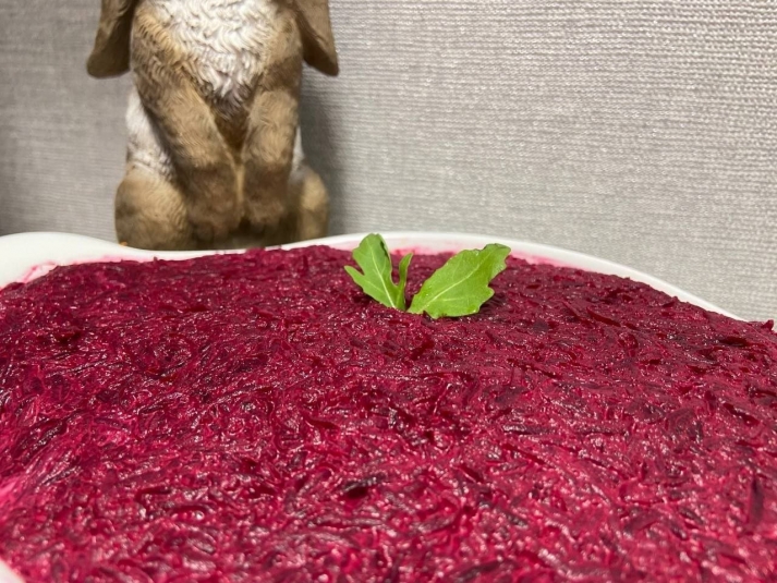Свеклу тщательно вымойте, заверните каждую в фольгу и запекайте в разогретой до 180°C духовке около 60 минут до мягкости. Дайте остыть, очистите и натрите на крупной терке. Яйца отварите вкрутую, остудите, очистите и нарежьте кубиками.