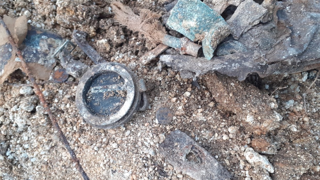 "При раскопе мы обнаружили, что это перекрытая рельсой землянка НП артиллерии 386 стрелковой дивизии. Были найдены газеты за 12 и 3 июня 1942 года. В НП было прямое попадание тяжелого снаряда, при проведении работ обнаружены 2 радиостанции, полевой телефон, 4 компаса, 3 бинокля, различные лампы, провода, личные вещи, знак ГТО 2 степени, линейки артиллерийские", — перечислили поисковики.