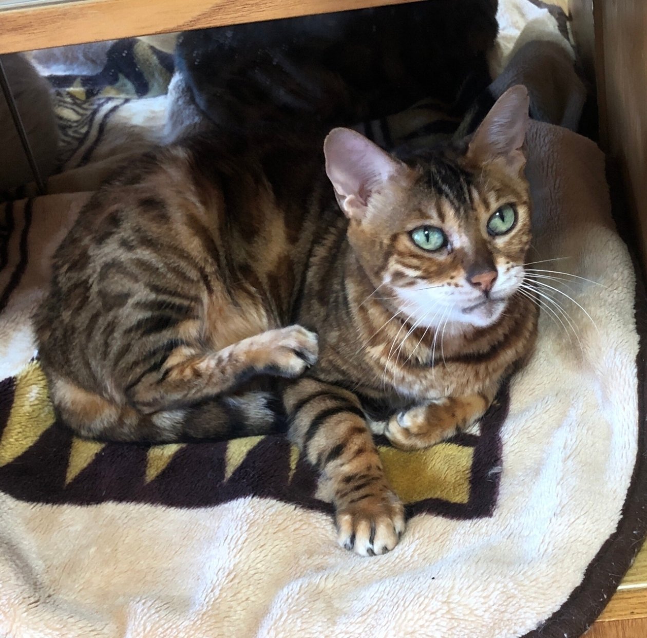 Чиара — кошечка невероятной красоты! Характер королевский — за ласками приходит, когда ее величество изволит, на ручках сидеть не любит. Зато одно ее присутствие принесет в дом действительно царскую атмосферу — не зря в ее роду были бенгалы. Такие кошки должны быть домашними любицами, а не жить в прайде.