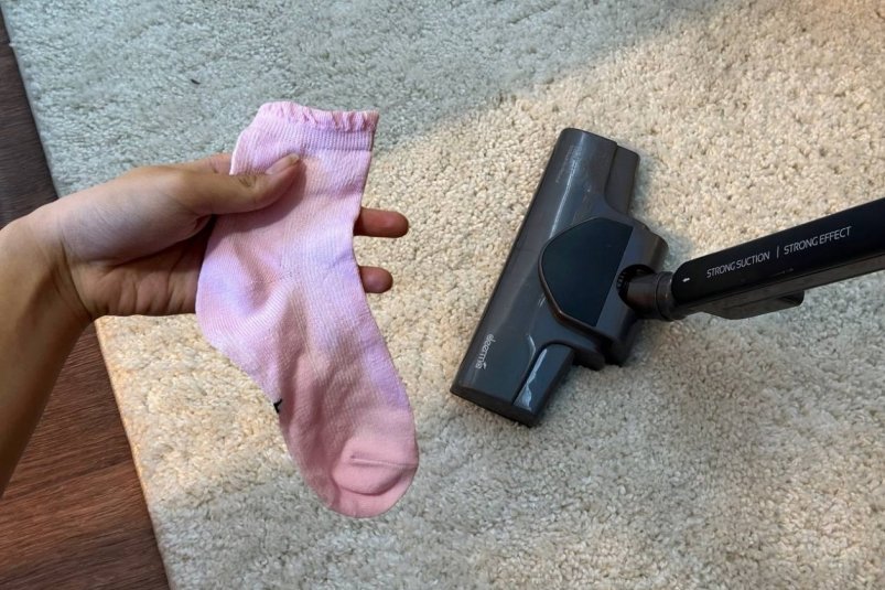 Секрет в обычном носке! Забудьте о стандартных насадках, которые застревают в коврах, перегружая двигатель пылесоса. Носок создает воздушную сетку, эффективно выбивая пыль и грязь, не повреждая ткань.