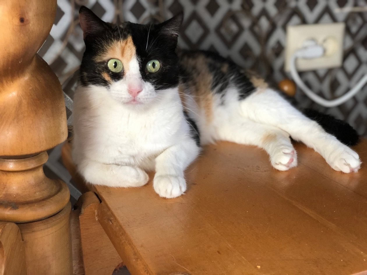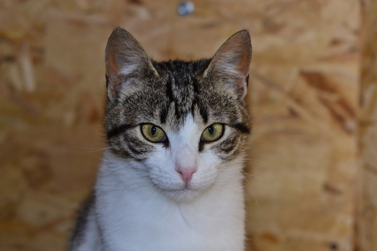 Штучка живет в котообщежитии с юного возраста. У нее необыкновенные янтарные глазки, будто подведенные стрелочками. А еще носик розовый сердечком, щечки — полосочками нарумяненные — просто фотомодель, которая украсит любой дом.