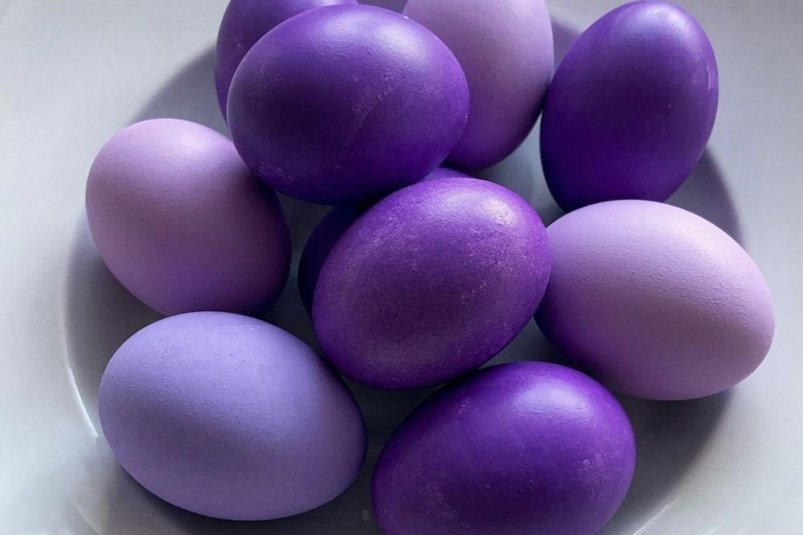 Корнеплод помогает получить разные оттенки бордового и фиолетового — от нежно-розового до насыщенного гранатового. В отличие от луковой шелухи, свёкла даёт именно яркое, праздничное настроение на пасхальном столе.