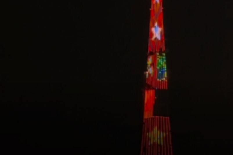 "Телебашня окрасится в цвет неба. На медиафасаде появятся слова: "С Праздником Весны и Труда!", флажки, воздушные шарики, весенние пейзажи и динамические переливы", — говорится в сообщении.