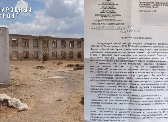 SevastopolMedia, 10 ноября. Прокуратура внесла представление местным властям из-за заброшенных зданий в Сакском районе, рассказали в Народном фронте Крыма. Речь идет о полуразрушенных зданиях двух корпусов школы, ФАПа и столовой, который находятся прямо по дороге детей от школьного автобуса и рядом с Братской могилой советских воинов в Листовом.