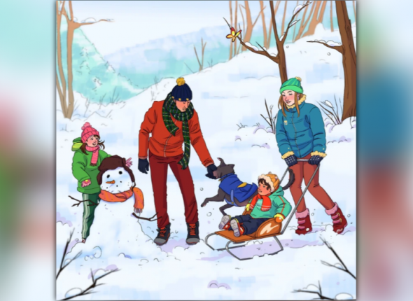 Итак, перед вами зимний лес. Семья весело проводит время, катаясь на санках и делая снеговика. Однакона картинке есть одно небольшое несоответствие. Попробуйте обнаружить его за пять секунд. Время пошло!