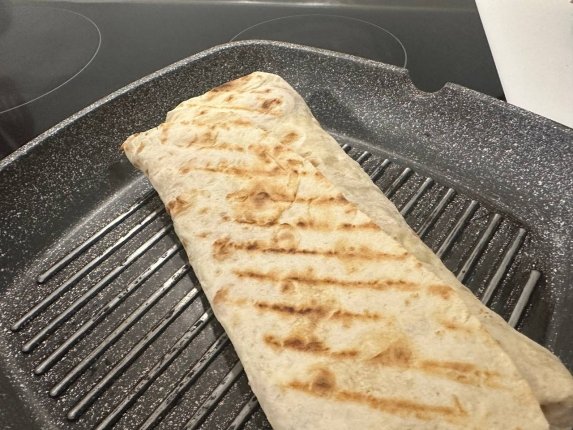 Разогрейте сковороду. Обжарьте рулет с двух сторон на среднем огне до появления золотистой корочки. Это займет буквально несколько минут.