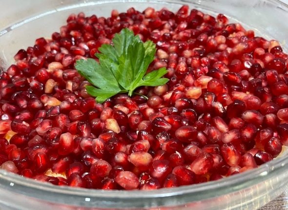 Каждый слой смажьте майонезом. А сверху украсьте салат гранатовыми зерна.