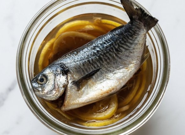 Плотно уложите рыбу в стеклянную банку и залейте холодным маринадом так, чтобы он полностью покрывал тушки. Сверху установите гнет, чтобы рыба не всплывала. Закройте банку крышкой и уберите в холодильник на 3 дня. Это важное условие для безопасности.
