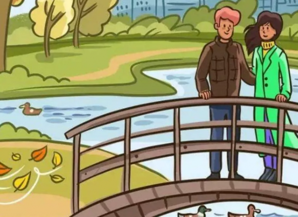 На изображении представлена влюбленная пара на мосту над рекой в осенний день. На первый взгляд, ситуация кажется обычной, однако присутствует несоответствие.