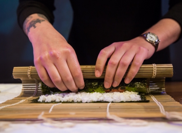 Аккуратно сверните все ингредиенты в плотный рулет. Нарежьте рулет на порционные кусочки, при необходимости подровняйте края.