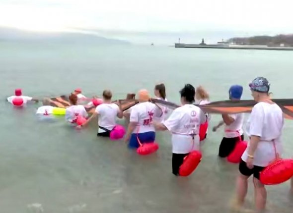 Массовый заплыв с 12-метровой георгиевской лентой засняли в Новороссийске