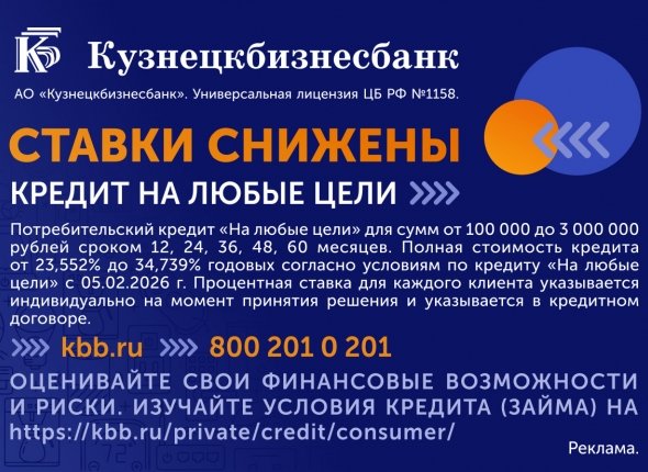 Реклама. Рекламодатель АО "Кузнецкбизнесбанк". Универсальная лицензия ЦБ РФ №1158. ИНН 4216004076, ОГРН 1024200001814. Юр. адрес: 654080, Кемеровская область, г. Новокузнецк, ул. Кирова, д. 89б.