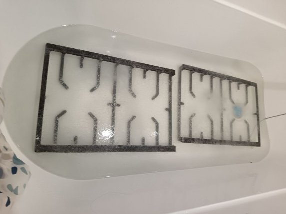 Полностью опустите решётку в раствор. Если она не помещается целиком, можно замачивать по частям или поворачивать в процессе. Важно, чтобы все загрязнённые участки были покрыты водой.